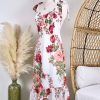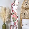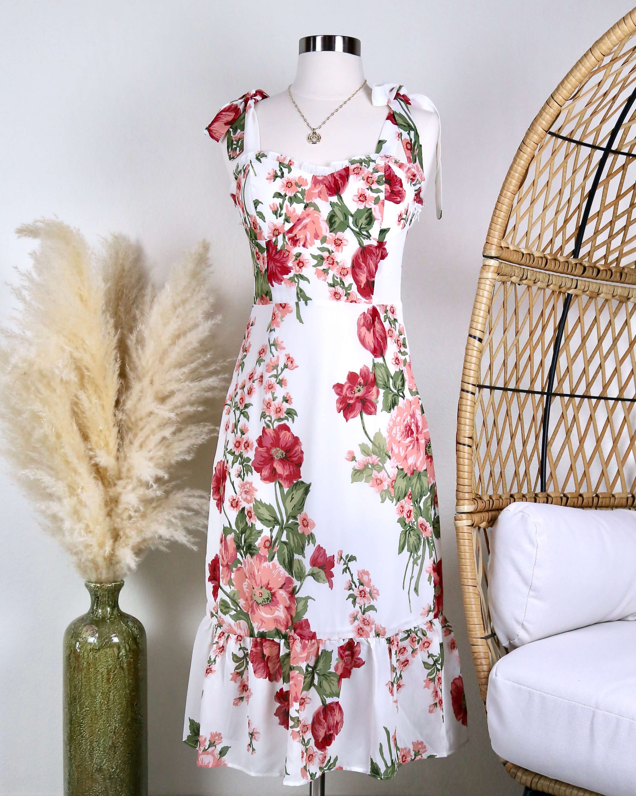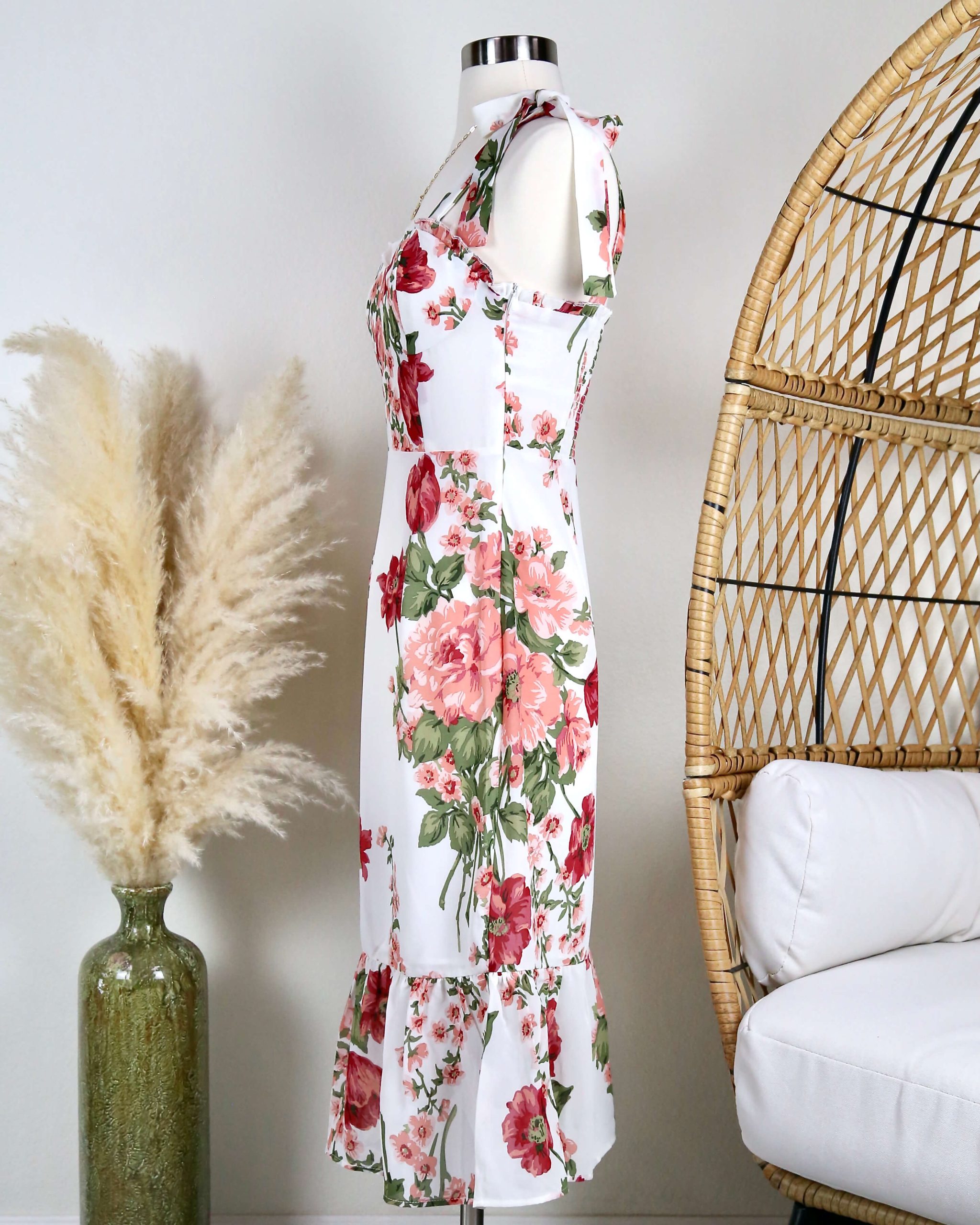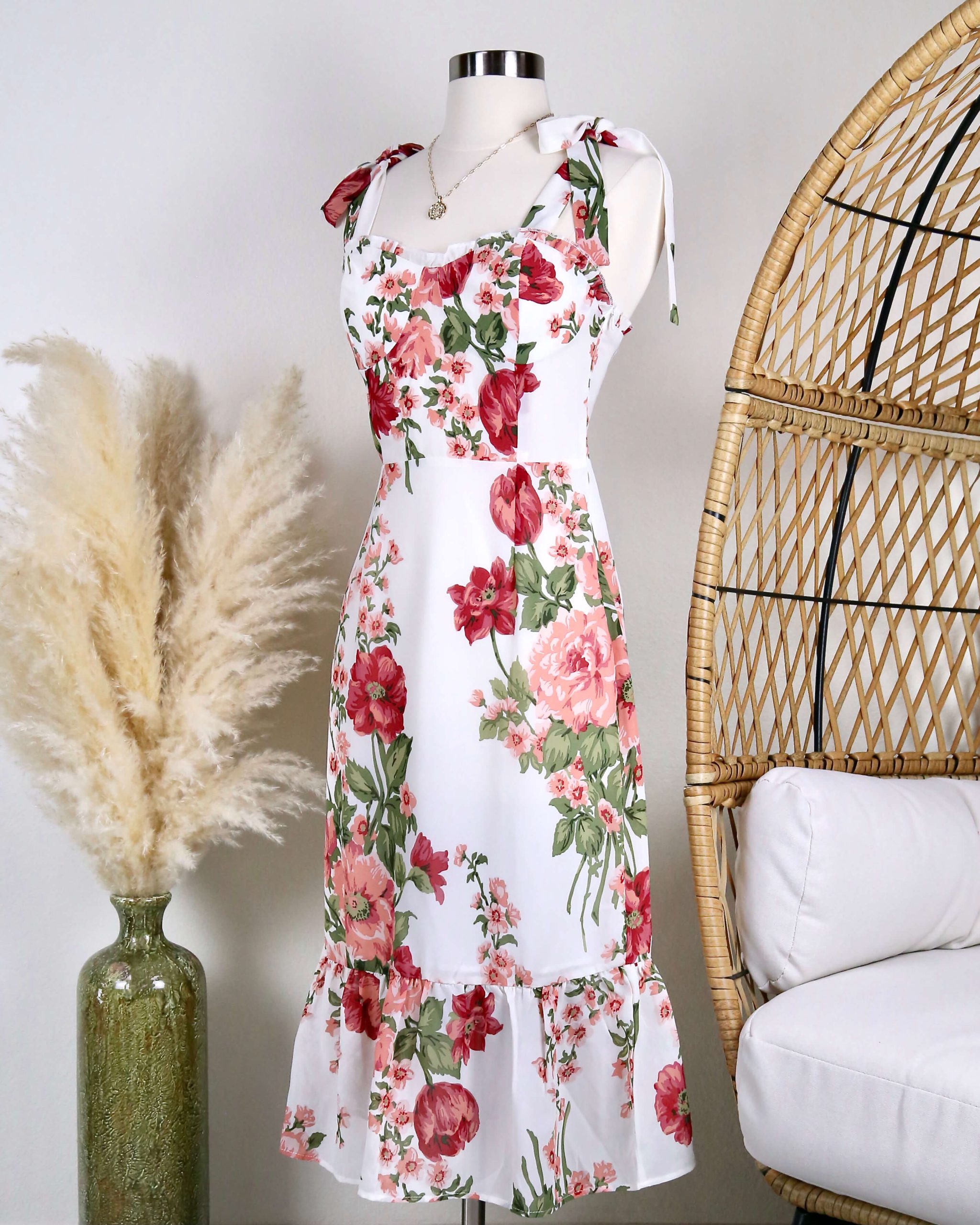 This beautifully constructed long dress features a tie strap design, smock back with hidden zipper, romantic floral prints and a chiffon like fabric design.