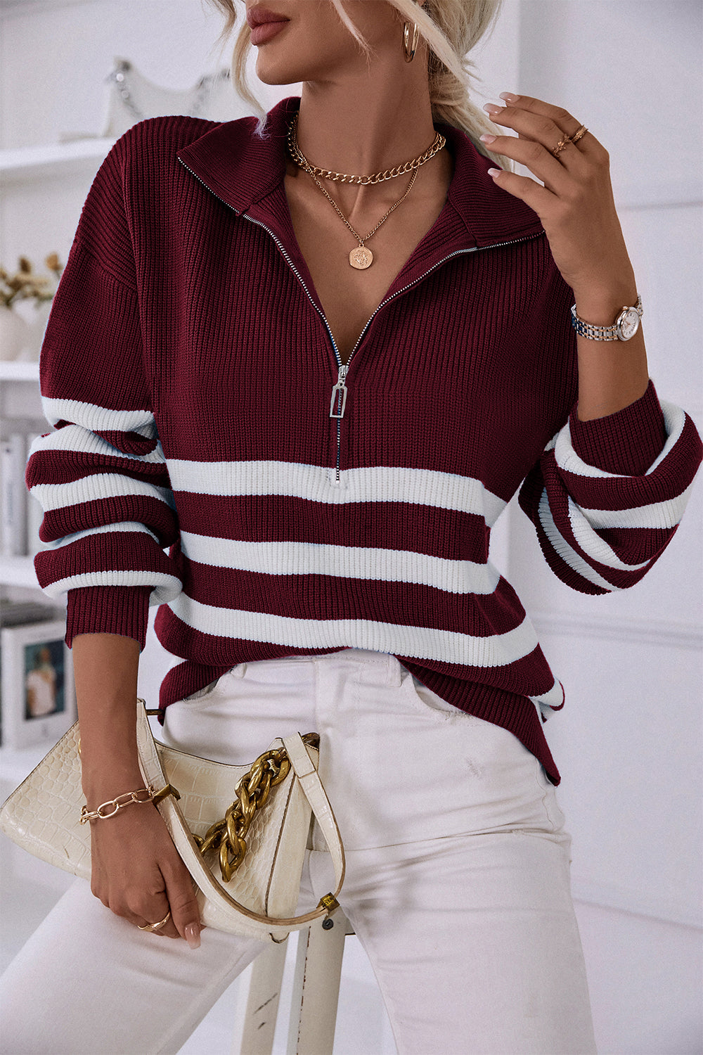 V Neck Collar Ribbed Knitted Stripe Pullover Sweater