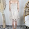 This dress is a dream come true. The braided straps creates a support for the buttoned up bodice and crochet-trim neckline. This gorgeous Wooldress dream dress features a godet-style skirt with a beige lace overlay extending down and dotted-mesh panels. Pair this with neutral lace overlay heels and pearl jewelries. There is no such thing as too much lace!